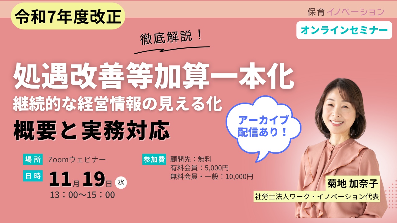 数多くの保育・認定こども園運営法人の賃金設計・労務管理実務対応を行っている 社会保険労務士 法人ワーク・イノベーションの事例や、参加者のご相談の声を取り上げながら、 新たな制度の実践的 な理解を深めることができる内容です。