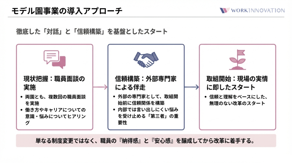 この事業では、職員面談を複数実施し、現場の声をしっかり拾いながら、それぞれの課題に応じた解決モデルを提示しています。