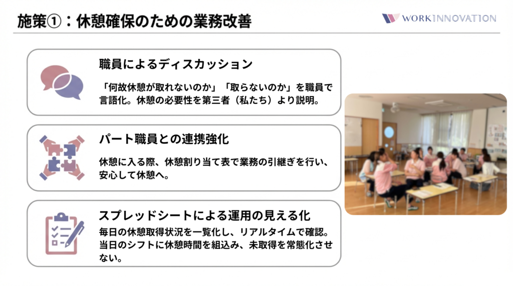 • A園(システム活用):勤怠打刻システムの本格運用を軸に、職員の「時間管理」に対する意識改革を支援。